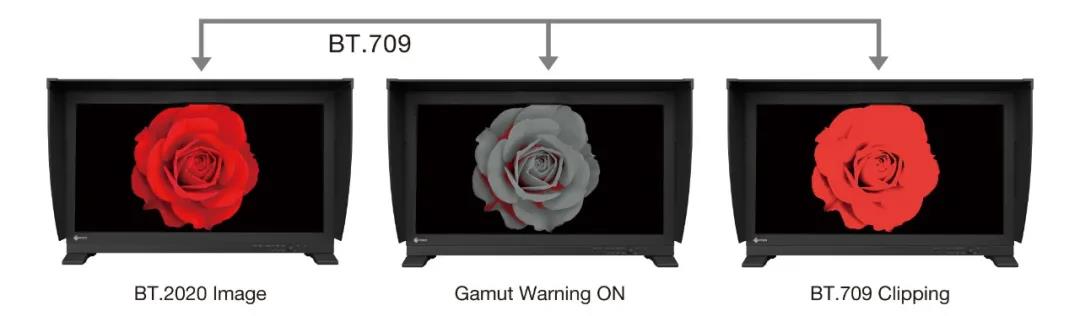 監(jiān)視器包含色域警告預(yù)設(shè)。選中后,將難以使用 Rec.709 還原的 Rec.2020 圖像區(qū)域轉(zhuǎn)為灰度圖,以明確顯示。另外被稱為 Rec. 709 Clipping 的模式允許編輯人員使用 Rec.709 色彩空間觀看 Rec.2020 圖像,模擬其在 HDTV 環(huán)境中呈現(xiàn)在觀眾眼前的效果。