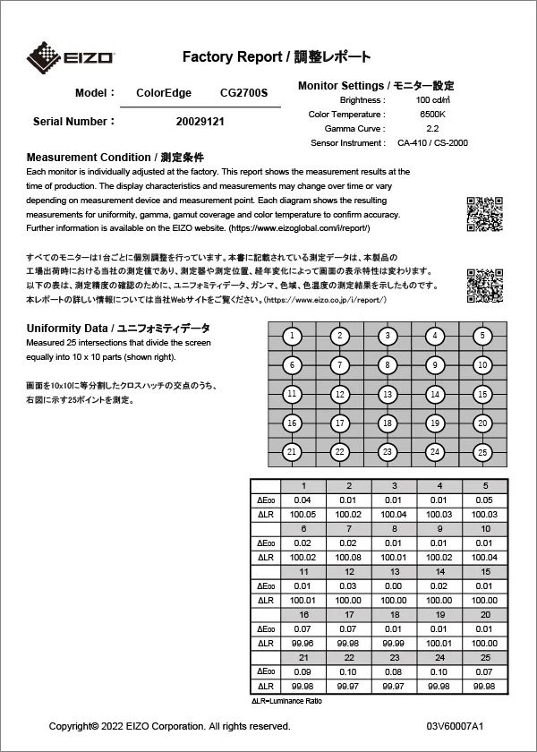 每臺ColorEdge CS2400S的包裝箱中都包含一份工廠報告,其中顯示了顯示器在生產(chǎn)時的測量結(jié)果。該報告包括均勻性、伽瑪、色域覆蓋范圍和色溫測量值,可驗證每臺顯示器的準確性。