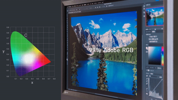 顯示器的廣色域真實再現(xiàn)了99%的Adobe RGB色彩空間,因此用Adobe RGB拍攝的圖像將被正確顯示。它還覆蓋了印刷中使用的幾乎完整的ISO-coated和US web-coated CMYK色彩空間。